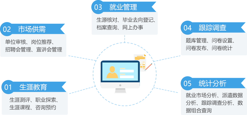 涵蓋生涯教育、市場供需、3377体育网站管理、跟蹤調查、統計分析等全過程管理。